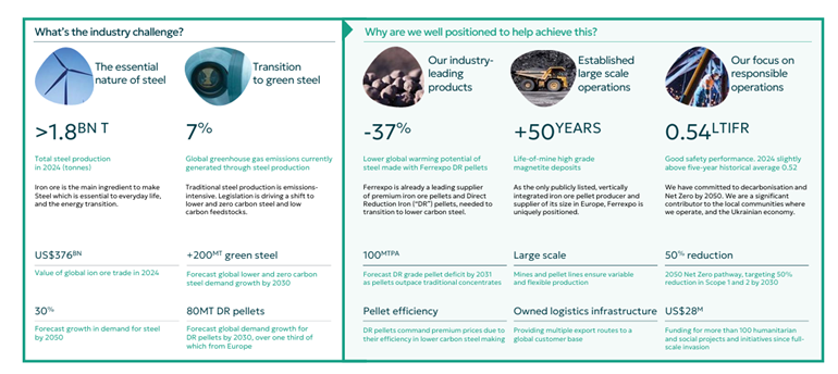 The Group produces high grade iron ore pellets which not only improve the productivity of steelmakers' blast furnaces, they also reduce carbon emissions. Ferrexpo is one of a limited number of listed companies that focus exclusively on producing high grade and high quality iron ore products, providing a clear pathway for those looking to invest in the decarbonisation of the steel industry.
